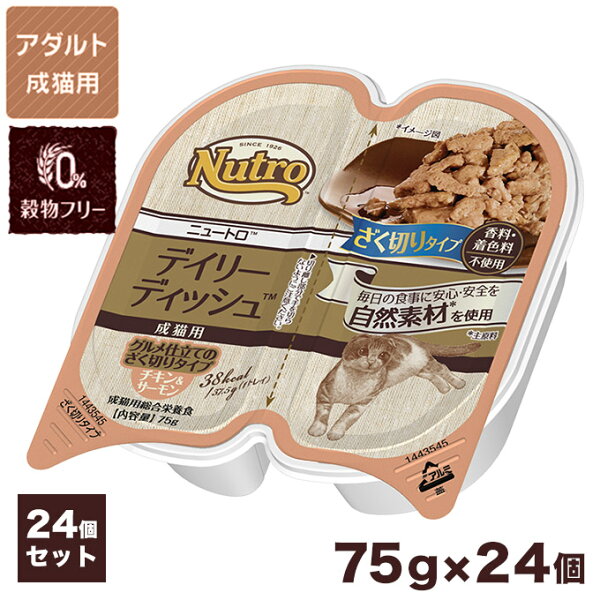 原材料 チキン、鶏レバー、サーモン、ポークプラズマ、チキンエキス、ひまわり油、トマト、ビタミン類、ミネラル類、アミノ酸類、増粘多糖類 保証成分 タンパク質 7%以上 脂質 3.5%以上 粗繊維 1%以下 灰分 3%以下 水分 82%以下 代謝エネルギー 38kcal/1トレイ 1日あたりの給餌量の目安 デイリー ディッシュのみを与える場合 ニュートロ室内猫用アダルトチキンと組み合わせて与える場合 体重(kg) 摂取カロリーの目安(kcal) デイリー ディッシュ(g) ドライ(g) デイリー ディッシュ(トレイ) 1 80 80 15 1 2 130 130 15 2 3 170 170 30 4 210 210 40 5 245 245 50 6 280 280 60 7 310 310 65 8 345 340 75 9 375 370 85 10 400 400 90 給与方法・ご注意事項 ●上記給与量の目安は成猫用です。